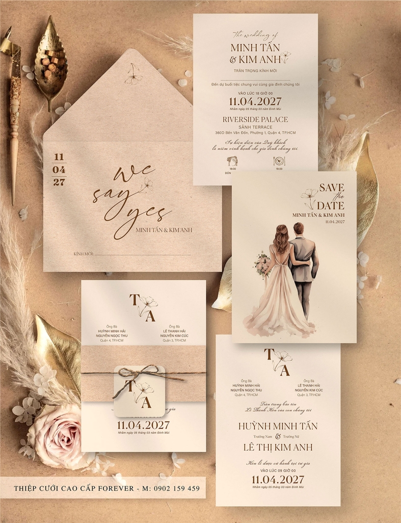 Ngày cưới sẽ được ghi dấu bằng một bộ thiệp cưới đầy tinh tế, nơi từng con chữ đều được trau chuốt, từng chất liệu đều được lựa chọn với sự nâng niu như chính câu chuyện tình yêu của các cặp đôi.